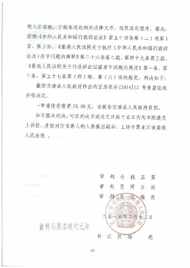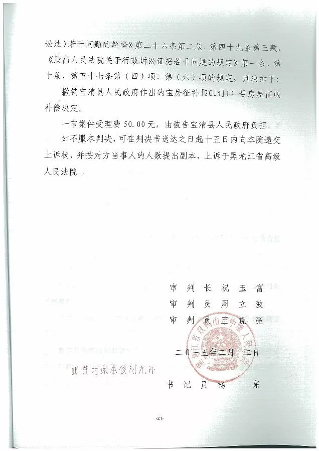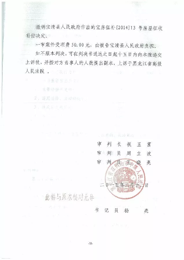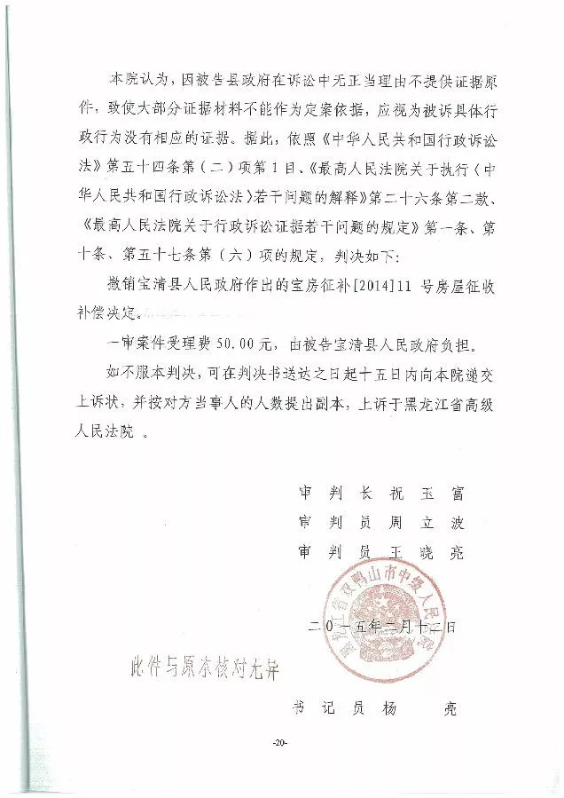 最终黑龙江省双鸭山市中级人民法院判决撤销宝清县人民政府对于XX等人作出的《房屋征收补偿决定书》(宝房征补[2014]12号);《房屋征收补偿决定书》(宝房征补[2014]11号);《房屋征收补偿决定书》(宝房征补[2014]13号);《房屋征收补偿决定书》(宝房征补[2014]14号)。