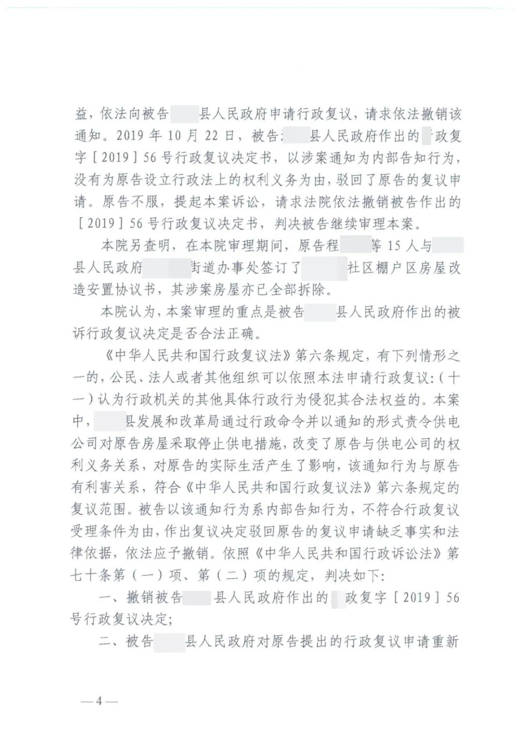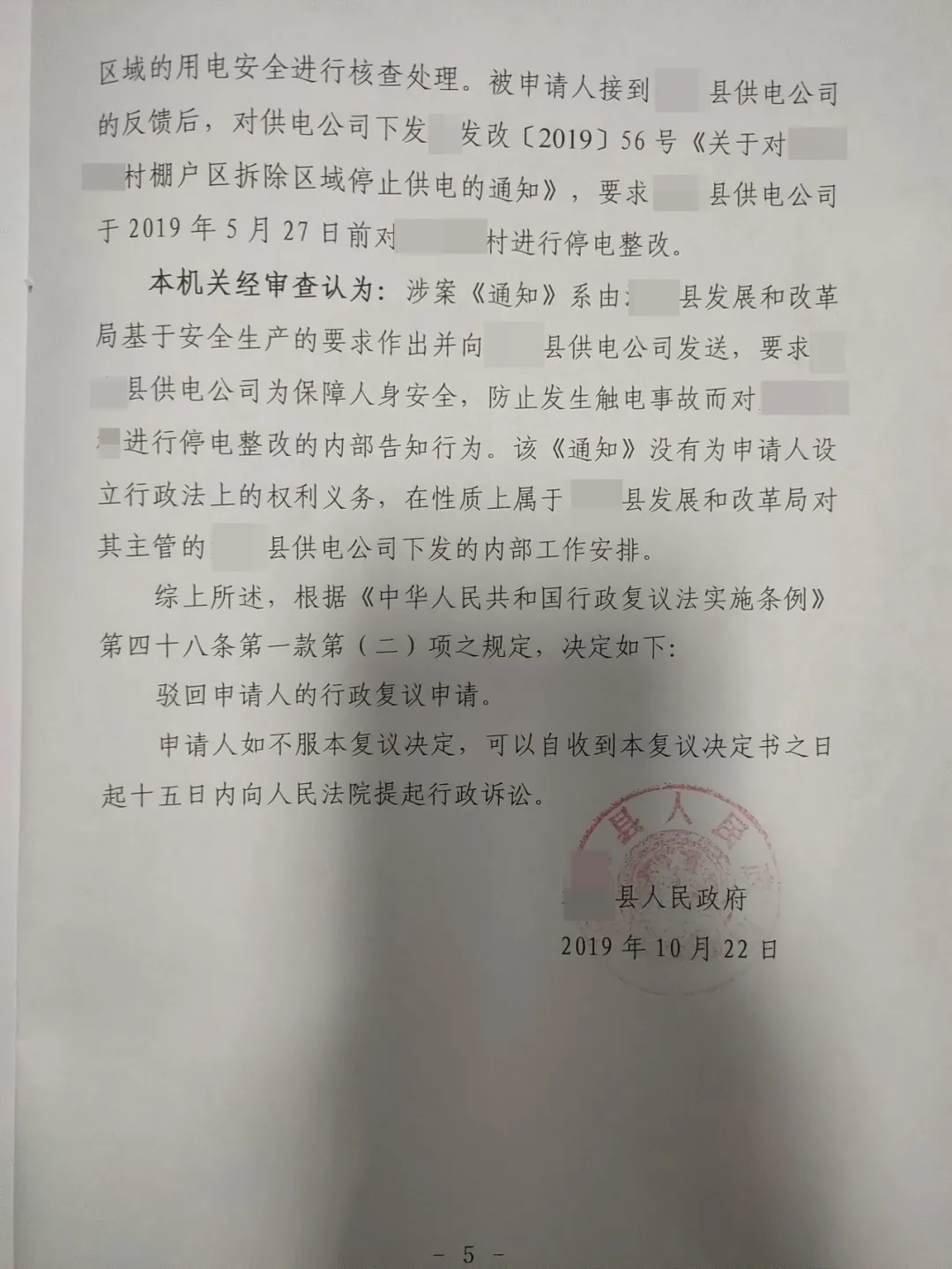 2019年10月28日收到xx县人民政府作出的(x政复字[2019]xx号)《行政复议决定书》,以停止供电通知为内部告知行为为由,驳回了原告的行政复议申请。