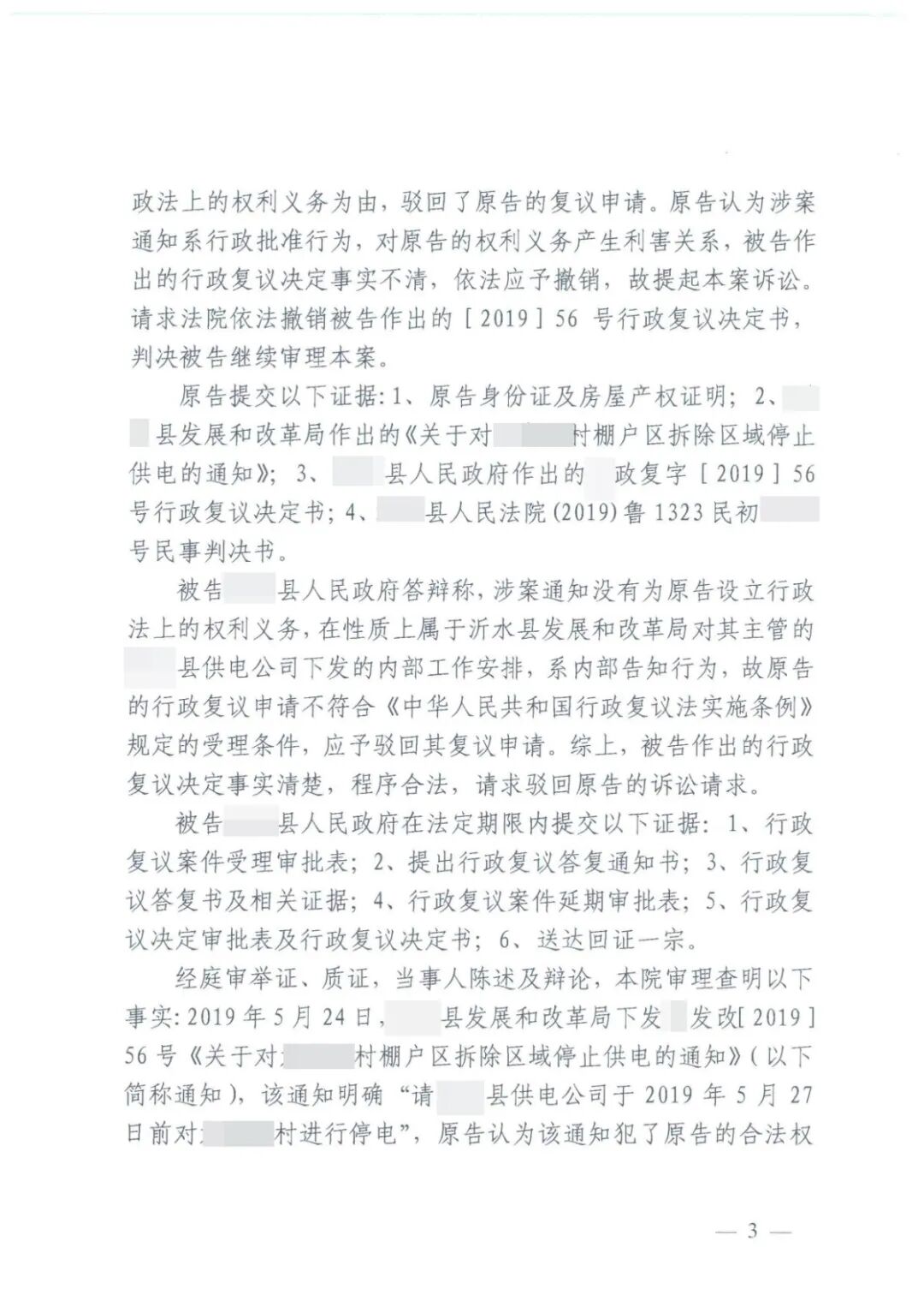 该村程xx、高xx等23位村民经邻村村民介绍了解到北京万典律师事务所,并联系了万典团队冯凯律、韩雷永两位律师,两位律师介入案件后,通过调查取证了解到,2019年5月24日xx县发展和改革局向县供电公司下发(沂发改【2019】xx号)《关于对xx村棚户区拆除区域停止供电的通知》(以下称“停止供电通知”),该通知明确“请xx县供电公司于2019年5月27日前对xx村进行停电”,时至夏日炎炎,停电问题严重影响村民基本的生活。